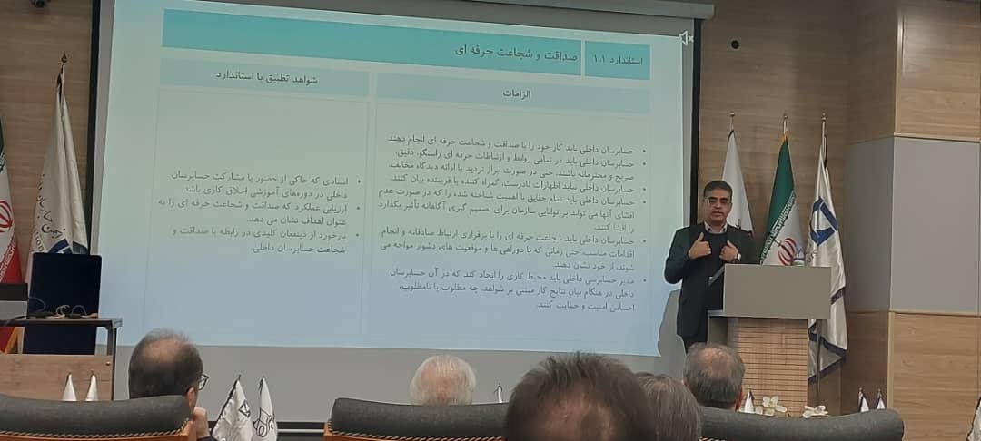 در ادامه، آقای دکتر وحید منتی، عضو هیئت علمی دانشگاه شهید بهشتی، به بررسی دقیق استانداردهای جدید پرداخته و نکات کلیدی و کاربردی مرتبط با اجرای آنها را برای شرکتکنندگان تشریح کرد. آقای عباس ارباب سلیمانی، رئیس پیشین هیئتمدیره انجمن حسابرسان داخلی و از پیشکسوتان این حرفه، سخنرانی ارزشمندی در خصوص اخلاق حرفهای در حسابرسی داخلی ارائه دادند. ایشان بر اهمیت تعهد اخلاقی، مسئولیتپذیری و نقش اخلاق حرفهای در ارتقای اعتماد و شفافیت سازمانی تأکید کردند.